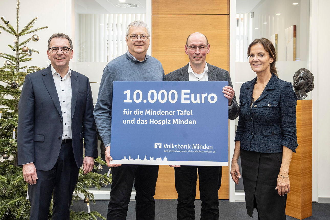 Ein Zeichen der Solidarität setzt in der Vorweihnachtszeit der Vorstand der VerbundVolksbank OWL eG mit (v. l.) Ansgar Käter, Ina Kreimer, Thorsten Wolff und Frank Sievert.